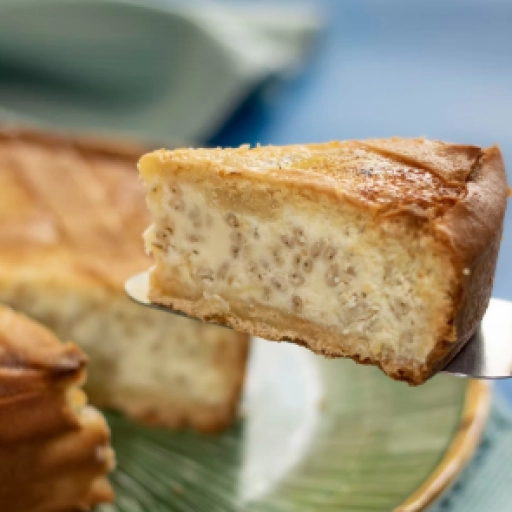 Recheada com ricota fresca, frutas cristalizadas, creme de gemas, pão de ló e lâminas de amêndoas.