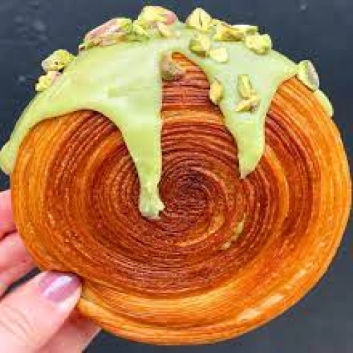 Recheio de creme de pistache puro, cobertura calda de pistache e granela de pistache